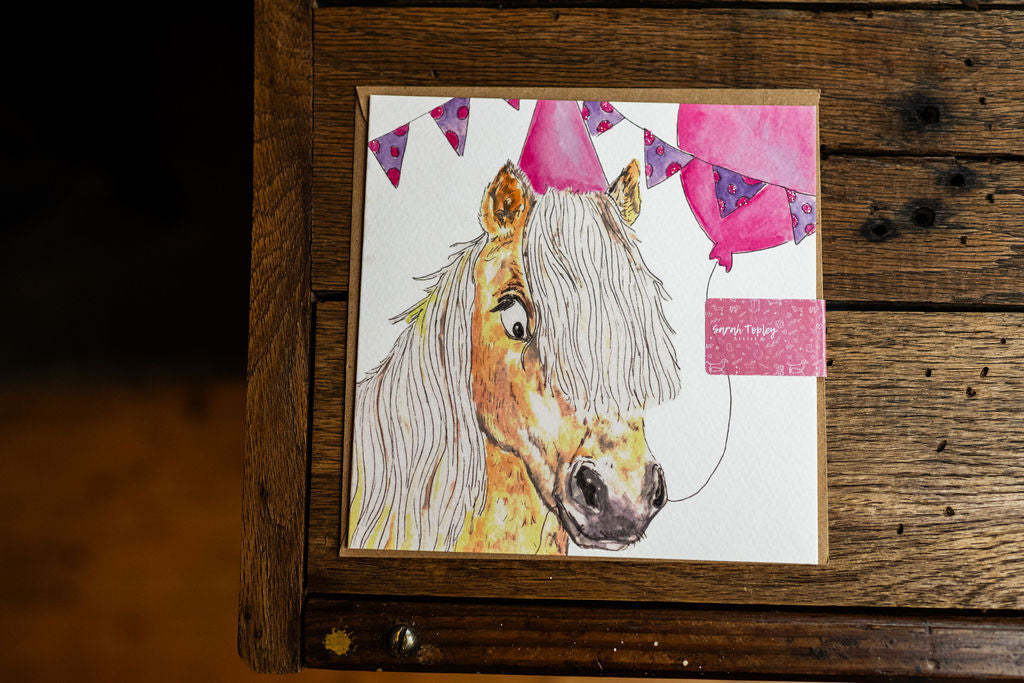 This Birthday card is inspired by my Shetland Pony Isla and is hand drawn by myself 'Sarah Topley Artist' using watercolour paints and fine line pen along with a touch of sparkle. Printed on fine Italian Tintoretto Gesso paper which has a warm white hue and a hammered finish. Printed in the U.K and fully recyclable.